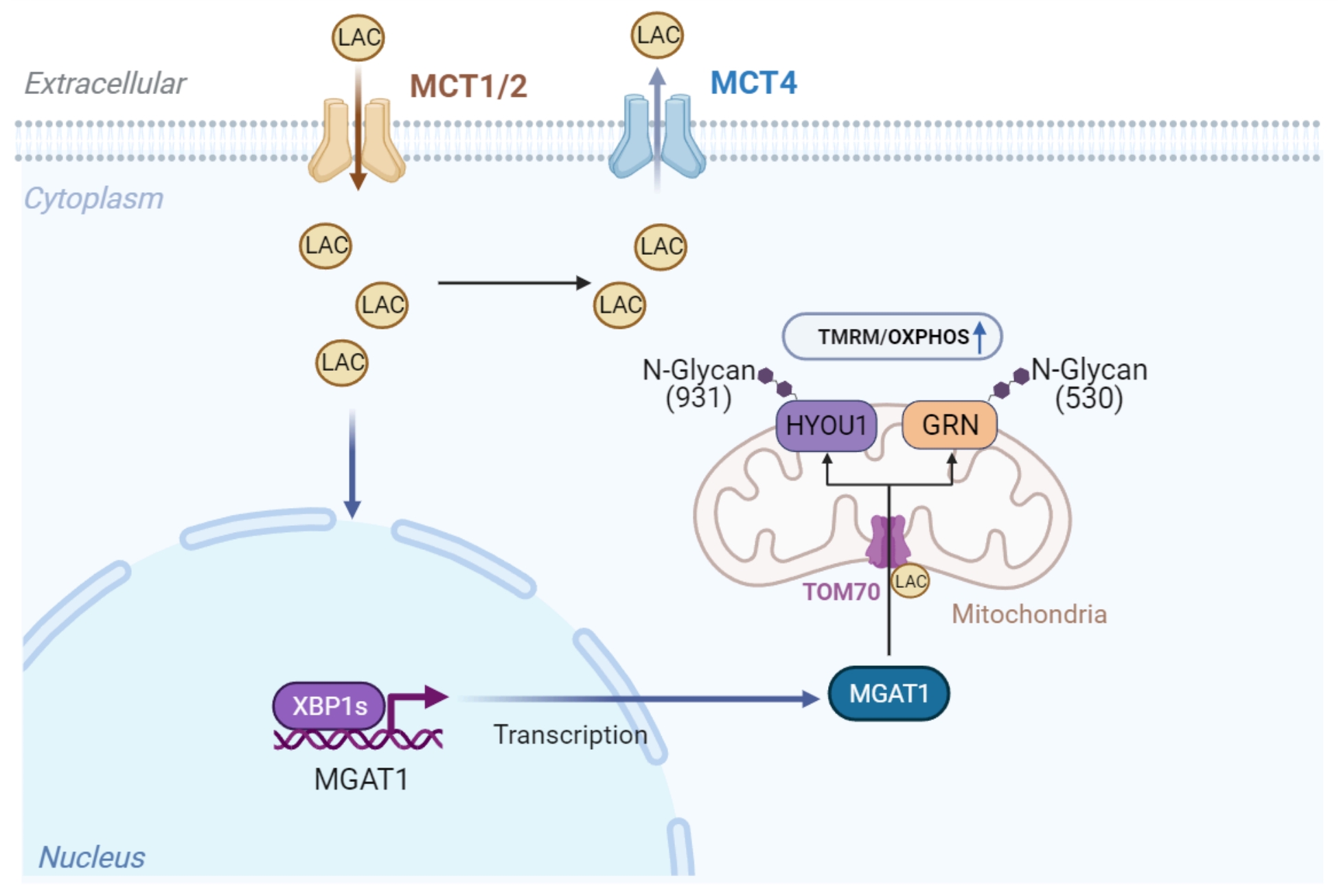 Results: Lactate promotes suppressive function and OXPHOS of memory and naïve Tregs. A high lactate environment increases MGAT1 expression in memory and naïve Tregs by mitochondrial proteomics. Lactate increases N-glycosylation of GRN and HYOU1 to promote Treg OXPHOS via MGAT1. Mitochondrial function of Treg declines after MGAT1 knockdown. A high lactate environment elevates XBP1s facilitates MGAT1 transcription. TOM70 is essential for the mitochondrial translocation of MGAT1 in high lactate environment. MGAT1 knockdown attenuates the therapeutic effect of Treg in a Xeno-GvHD model.