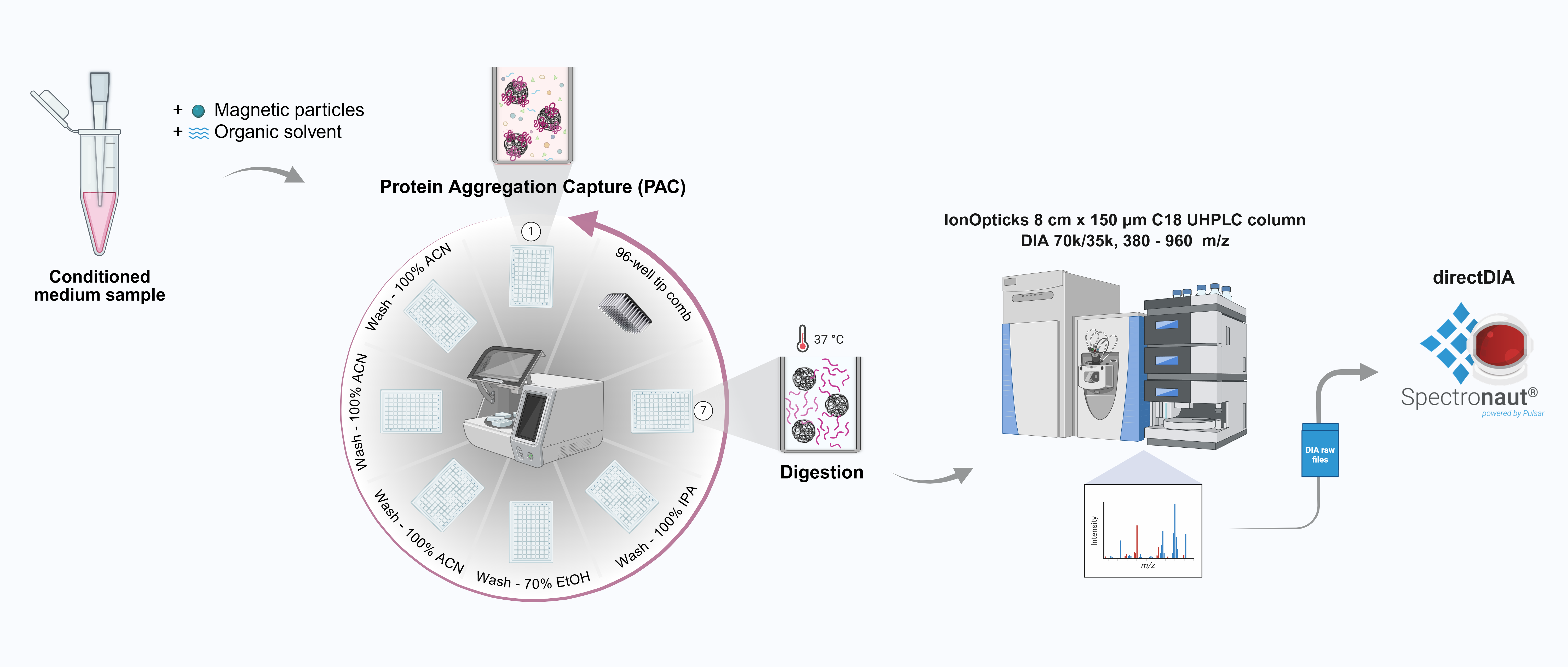 Methods: hAEC from 20 donors were isolated according to cGMP procedures, and validated both on intact cells and released vesicles (hAEV). We exposed hAEC to different culture conditions and stimuli, aimed to enhance their secretory properties. Conditioned media from 96 samples were processed using a semi-automated workflow to isolate proteins via Protein Aggregation Capture (PAC) on magnetic beads [1]. Following enzymatic digestion, peptides were purified using an in-StageTip method [2] and analysed by data-independent acquisition on a high-resolution Orbitrap mass spectrometer.