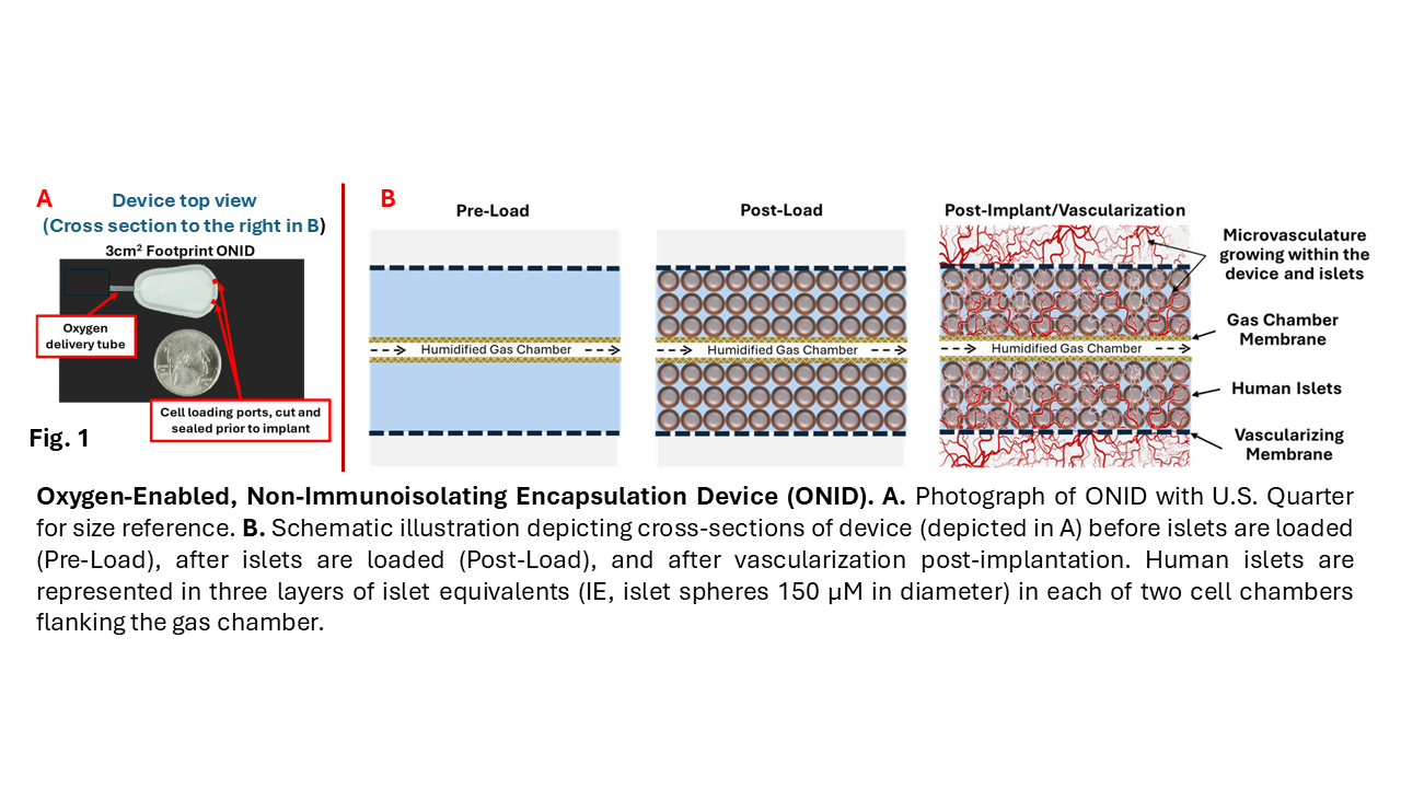 Methods: Male Crl:NIH-Foxn1rnu nude rats rendered diabetic with streptozotocin were implanted with a single oxygenated device (ONID) consisting of an oxygenated lumen bordered by two islet-containing chamber the outer membranes of which facilitate vascularization of the device (Fig. 1).