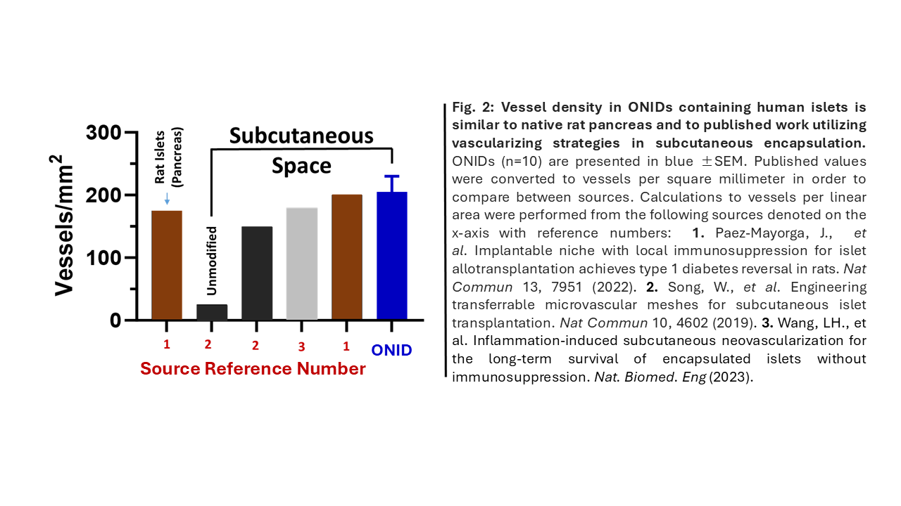 Conclusion: Oxygen-supplemented, SC implanted ONIDs containing high densities of human islets reversed diabetes in nude rats. Vascularization surrounding the ONID correlated with tolerance to discontinuation of O2. Importantly, the 3cm2 footprint ONID supported 80,000 IE human islets, a clinically relevant density. This proof-of concept study with human islet-containing ONIDs reaffirms the essentiality of supplemental oxygen until a supportive vasculature can provide sufficient O2.