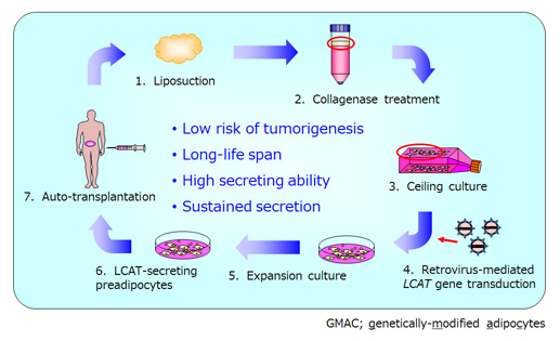 Introduction: Familial lecithin:cholesterol acyltransferase (LCAT) deficiency (FLD) syndrome is an autosomal recessive disease characterized by low plasma LCAT activity and severe dysfunction of HDL with subsequent impaired lipoprotein metabolisms. Patients often develop complications such as corneal opacity, hemolytic anemia, and renal dysfunction. In plasma protein deficiency such as LCAT deficiency, gene therapy-mediated continuous enzyme replacement is the most suitable therapeutic approach. We have postulated adipocyte-based ex vivo gene therapy-mediated enzyme replacement therapy (ERT), in which genetically-modified adipocytes (GMAC) reside at transplanted sites to continuously supply therapeutic proteins. We have applied our GMAC technology to treat FLD via transplantation of LCAT gene-transduced autologous preadipocytes (LCAT-GMAC).