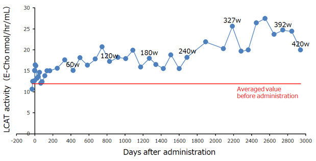 Results: Post administration pain was observed, however, no other treatment-related adverse effects were observed. In addition, no replication-competent retrovirus in patient's blood sample or tumorigenicity of the LCAT-GMAC was observed. Increased serum LCAT activity has sustained for 240 weeks. Together with changes in laboratory values related to lipid metabolism, the long-term amelioration of abnormal lipoprotein metabolism was suggested in the patient. The hemoglobin-haptoglobin complex produced with hemolytic anemia was also reduced, which suggested improved vulnerability of erythrocytes. The patient is still undergoing follow-up and still has persistent LCAT activity in his blood eight years after the administration of LCAT-GMAC.