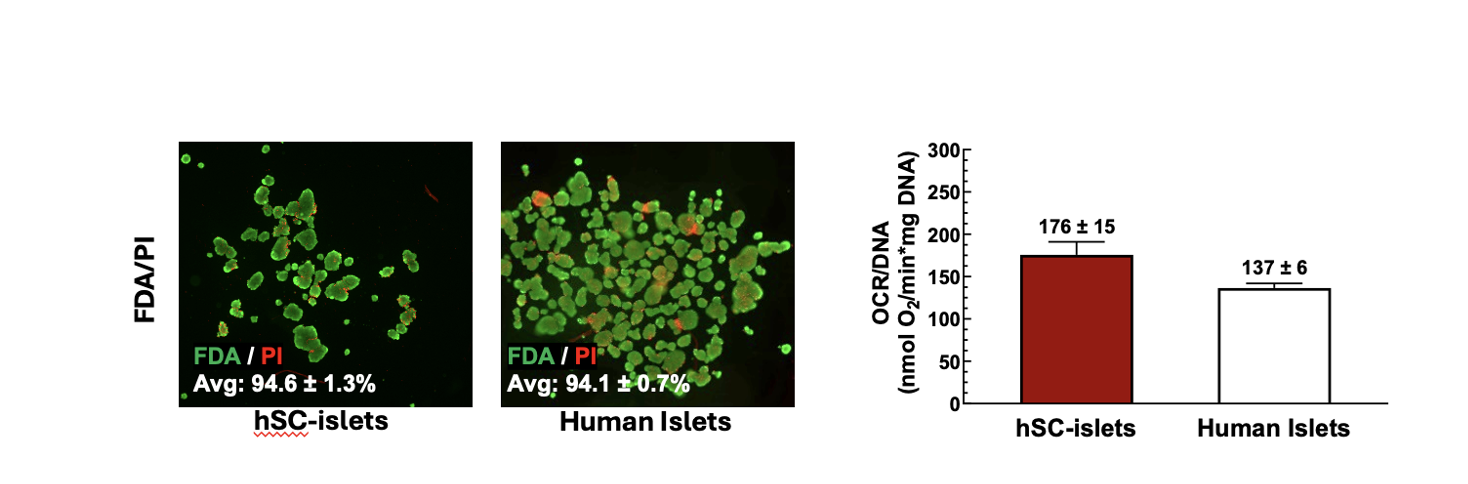 Conclusion: These findings demonstrate that hSC-islets can be shipped internationally using silicone rubber membrane vessels while retaining high viability and functionality. This supports the potential use of hSC-islets as a promising alternative to human islets as well as the benefits of using gas-permeable vessels. Future work will include performing the same panel of assessments pre-shipment to enable direct comparisons as well as transplantation into diabetic rodents to demonstrate in vivo functionality.