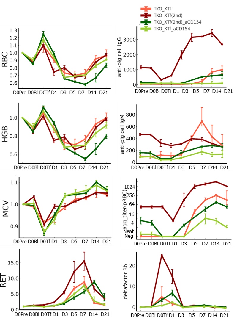 Methods: Triple knockout (TKO) genetically modified pigs (Optipharm Inc, Korea) provided RBCs for transfusion. Following a withdrawal of 25% of their blood volume, NHPs received TKO pRBC transfusions along with PG-405 (anti-CD154(Fab)-NTIG-IL-10, ProGen, Korea; 30mg/kg, IV), with the same dosage administered again three days later (TKO XTf_aCD154, N = 4). Eight weeks later, after another blood withdrawal, two NHPs received repeated pRBC transfusions with anti-CD154 administration in the same manner (ReXTf_aCD154, N = 2). Blood samples were collected at multiple time points to measure hematological and biochemical parameters, cytokine profiles, complement profiles, and anti-pRBC antibody levels. These results were compared with those from previous experiments without anti-CD154 administration: TKO pRBC transfusions (TKO XTf, N=8) and repeated transfusions (ReXTf, N=2).