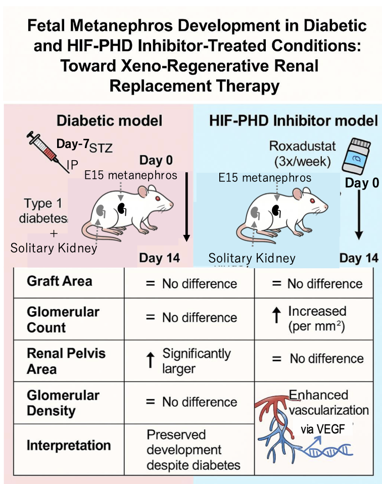 Fetal metanephros transplantation is feasible and effective under both diabetic conditions and HIF-PHD inhibitor treatment. These findings support the compatibility of clinical CKD environments with metanephros development. The observed enhancement in glomerular density implies improved vascular invasion, which will be further assessed through VEGF expression analysis and vascular visualization in cleared metanephroi.