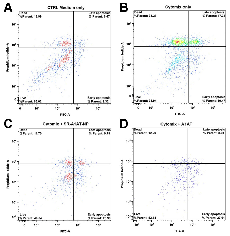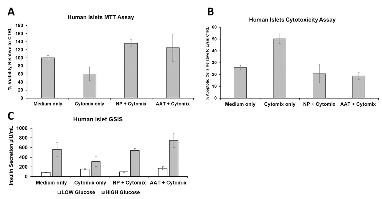 Methods: Human pancreatic islets were obtained from Prodo Laboratories Inc. and cultured under standard conditions. Redox-responsive nanoparticles encapsulating alpha-1 antitrypsin (SR-A1AT-NPs) were synthesized using a dextran-based formulation and applied to the islet cultures for 24 hours. Nanoparticle uptake was confirmed via fluorescent labeling and confocal microscopy. Islets pre-treated with SR-A1AT-NPs were subsequently exposed to an in vitro inflammatory cocktail (Cytomix: TNF-α, IL-1β, and IFN- γ). Viability and mitochondrial function were assessed using G6PD and MTT assays, respectively. Flow cytometry with Annexin V and propidium iodide staining was performed to quantify live/dead and early/late apoptotic populations. Functional integrity was evaluated via glucose-stimulated insulin secretion (GSIS) assays.