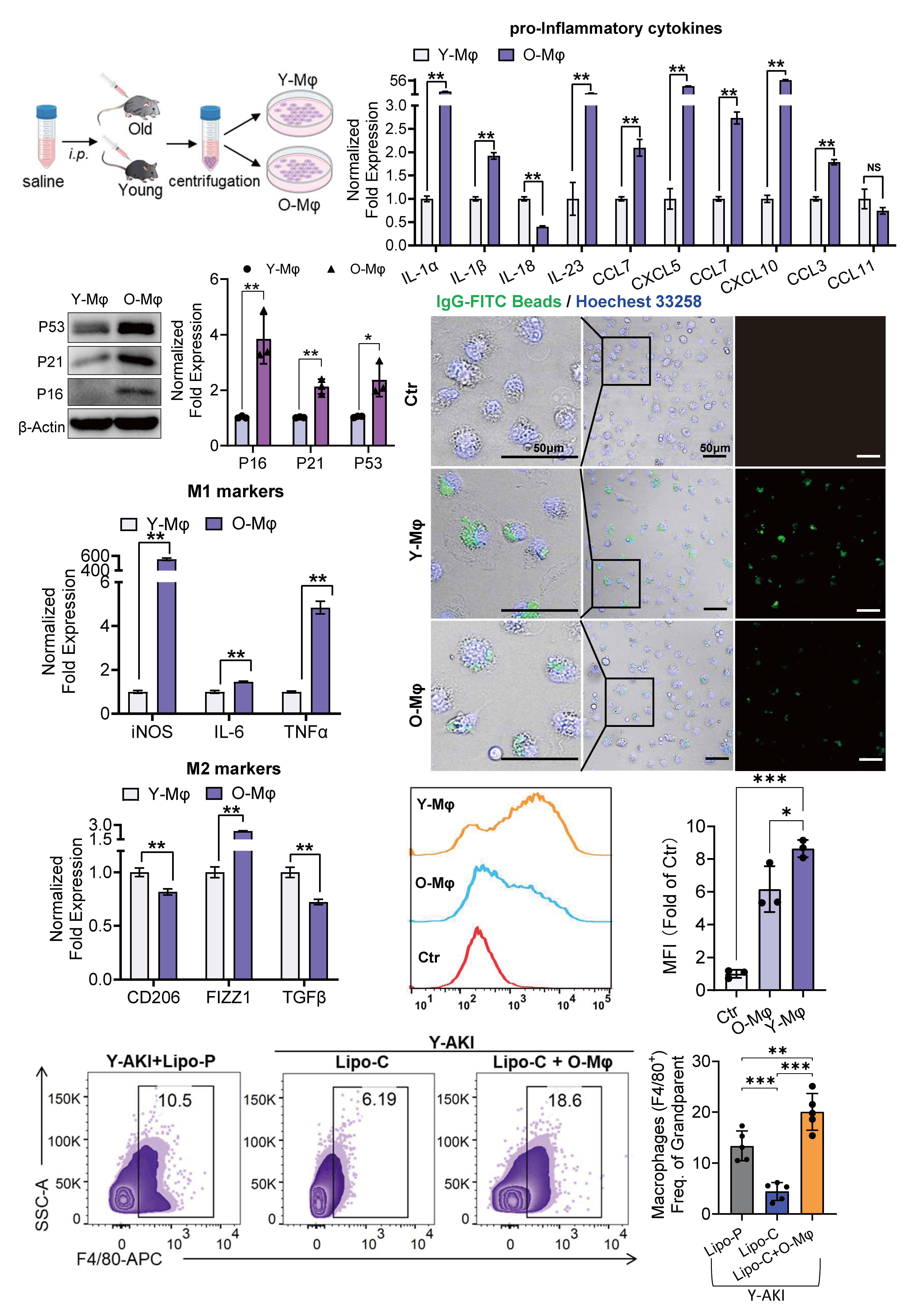 Results: In our study, peritoneal macrophages from aged mice exhibited a bias toward M1 polarization, along with diminished phagocytic capacity and persistent low-grade inflammation. Aging also amplified renal inflammation following acute kidney injury (AKI), marked by shifts in kidney immune cell composition, with pronounced alterations in macrophage subsets. These changes mirrored age-associated defects in the innate immune function of peritoneal macrophages, including impaired M1/M2 polarization dynamics (Fig. 1). Notably, in vivo depletion of kidney-resident macrophages in aged mice attenuated renal inflammation, mitigated tissue injury, and restored mitochondrial function. In contrast, adoptive transfer of aged peritoneal macrophages into young AKI mice exacerbated kidney damage and inflammatory responses.