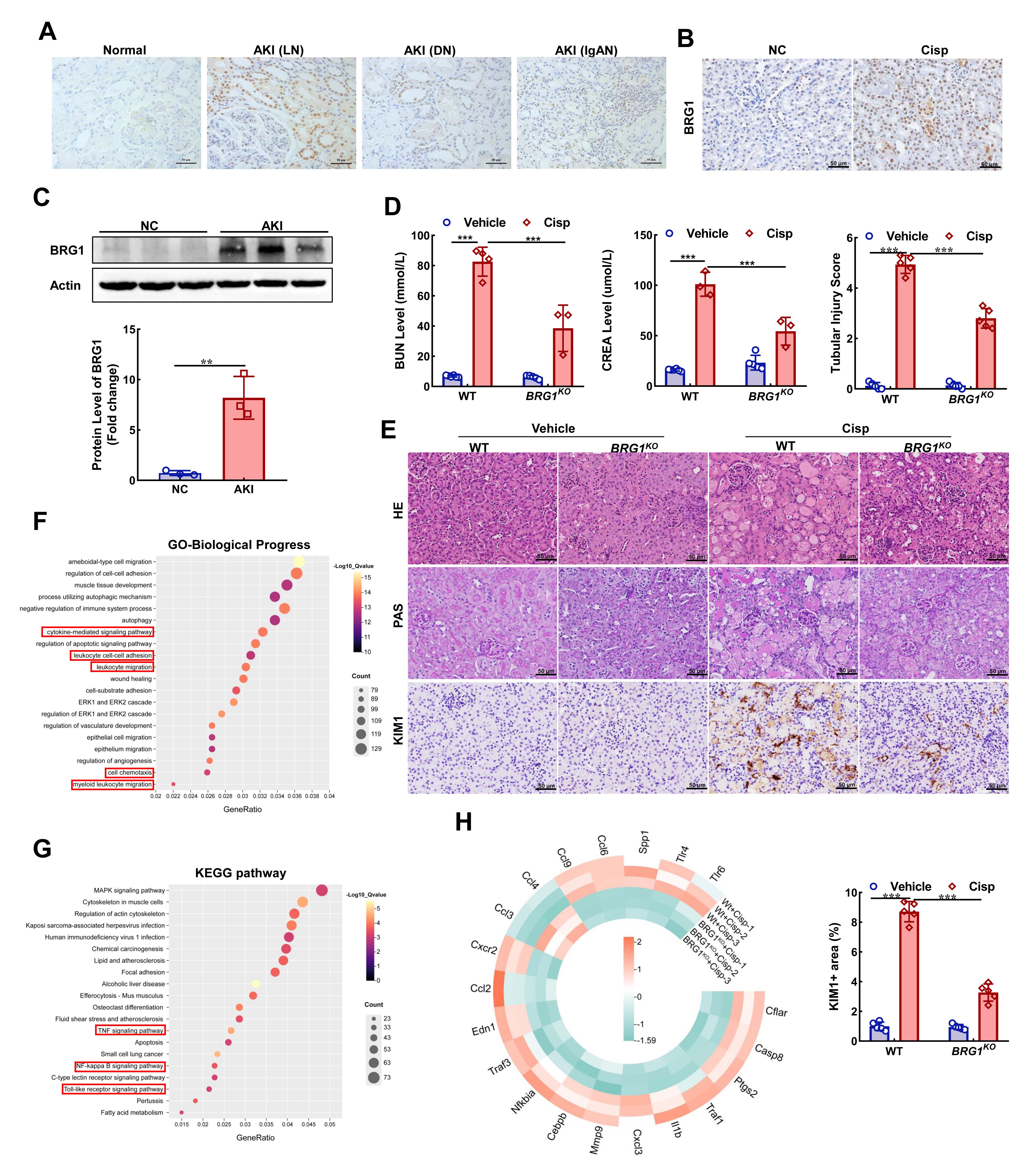Methods: We initially assessed BRG1 expression in kidney from AKI patients and a cisplatin (Cisp)-induced AKI mouse model. Tubular epithelial cell (TECs)-specific BRG1 knockout mice (BRG1KO) were generated to investigate the role of BRG1 in AKI pathogenesis. After Cisp administration, renal function, histopathology, inflammation, immune cell infiltration, and single-cell RNA sequencing were performed. Results BRG1 expression was significantly elevated in the kidney tissues of AKI patients and the mouse AKI model, with predominant localization in TECs within the affected kidneys (Fig. 1A and 1B). Following Cisp injection, compared to wild-type (WT) mice, BRG1 knockout significantly reduced CREA and BUN levels, improved renal histopathology, and downregulated KIM1 expression (Fig. 1C-1E). Furthermore, BRG1 deficiency substantially attenuated the inflammatory response in AKI, as evidenced by alterations in inflammation-related signaling pathways and biological processes, and a marked downregulation of inflammation-associated gene expression in renal tissue (Fig. 1F-1H).