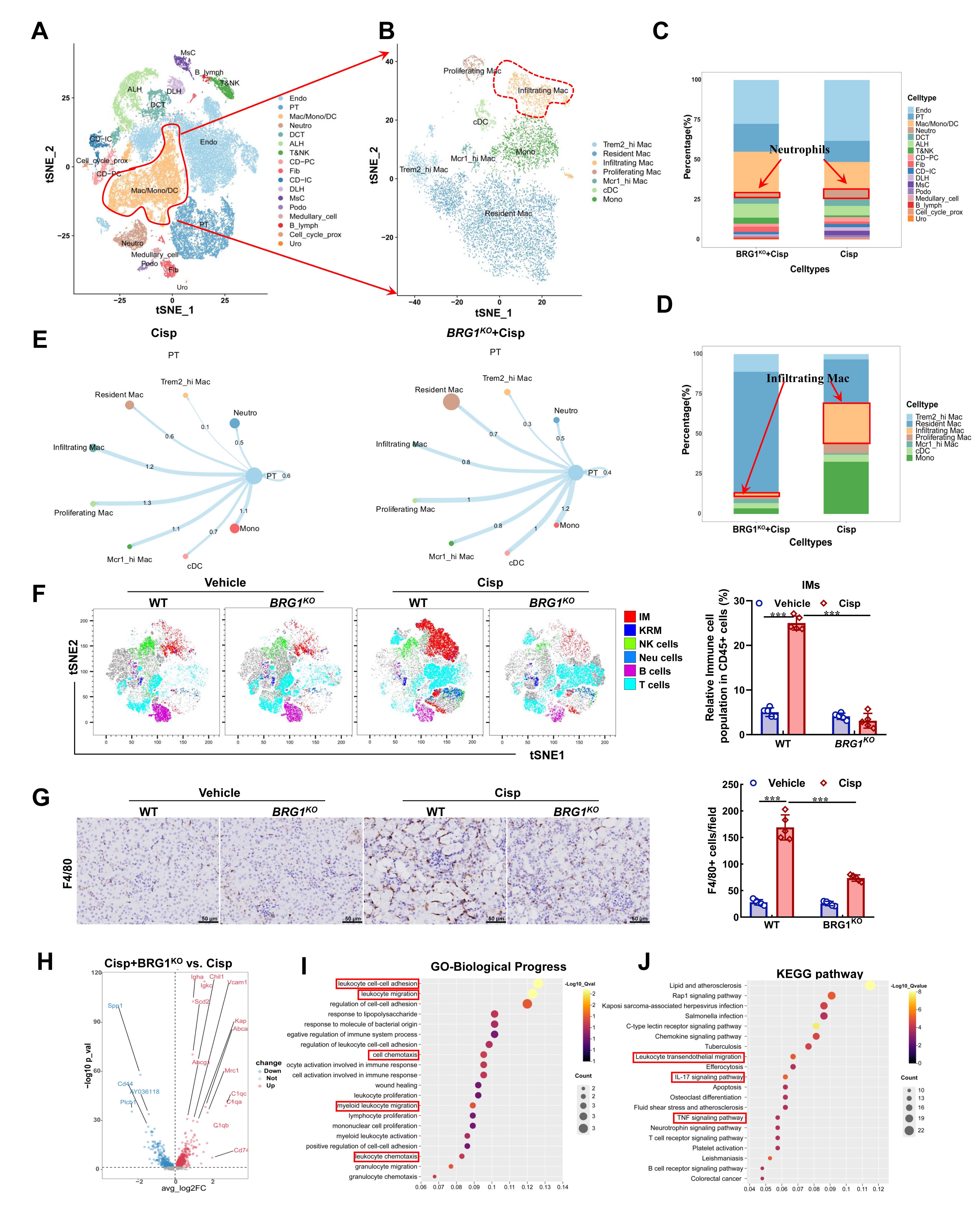 Dimensionality reduction and clustering analysis of all sequenced cells revealed a significant reduction in the proportion of infiltrating macrophages (IMs) and neutrophils in the kidneys of BRG1KO-AKI mice (Fig. 2A-2D). Deletion of BRG1 specifically reduced the communication between TECs and IMs, without affecting TEC-neutrophil communication (Fig. 2E). Consistently, flow cytometry and immunohistochemical demonstrated that BRG1 knockout significantly diminished macrophage infiltration in AKI (Fig. 2F and 2G). These findings suggested the TEC- IM communication may be the key to knocking out BRG1 to inhibit the inflammatory response in AKI and thereby improve renal injury. GO and KEGG analyses of differentially expressed genes in IMs discovered that BRG1 deletion in TECs suppressed the chemotactic effects of IMs, thereby reducing their infiltration into the kidney (Fig. 2H-2J).