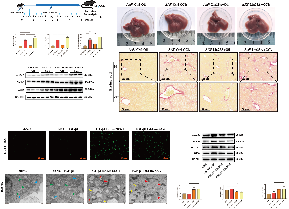 Results: Lin28A expression was significantly upregulated in human cirrhotic liver tissues and mouse fibrotic livers, where it co-localized with activated α-SMA⁺ hepatic stellate cells (HSCs). HSC-specific overexpression of Lin28A exacerbated CCl₄-induced liver fibrosis, manifested by increased collagen deposition, elevated serum ALT/AST levels, and upregulated α-SMA and Col1a2 expression. Conversely, Lin28A knockdown suppressed TGF-β1-induced HSC activation, reducing cell migration, proliferation, and α-SMA/Col1a2 expression, and concurrently triggered ferroptosis. This Lin28A deficiency-induced ferroptosis was confirmed by characteristic hallmarks, including mitochondrial condensation, elevated reactive oxygen species (ROS), iron accumulation, glutathione (GSH) depletion, and downregulation of GPX4 and SLC7A11. Furthermore, HMGA2 expression exhibited a positive correlation with Lin28A levels both in vitro and in vivo. Mechanistically, rescue experiments demonstrated that HMGA2 overexpression partially reversed the enhanced ferroptosis sensitivity and restored migration capacity induced by Lin28A knockdown. Critically, the Lin28A-specific inhibitor C1632 promoted ferroptosis in activated HSCs in vitro and attenuated CCl₄-induced fibrosis in vivo, reducing collagen accumulation, α-SMA expression, and serum ALT/AST levels.